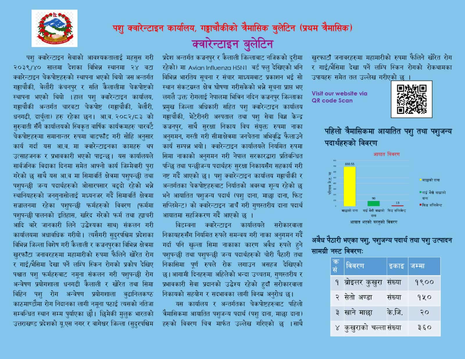 पशु, पशुजन्य पदार्थ तथा पशु उत्पादन सामग्री तथा रोगहरुको अध्यावधिक तथ्यांक राखी पशु क्वारेन्टाइन महाशाखा, पशु सेवा विभाग ्रमा पठाउने ।